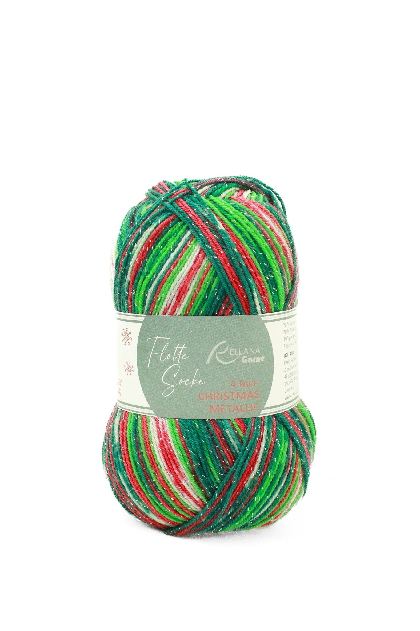 Holiday inspired with festive colours, Flotte Socke Christmas is a self-patterning 4-ply wool and polyamide blend sock yarn, available in both regular and glitter colourways. This holiday season yarn is also perfect for making ornaments to adorn gifts or string as garlands.