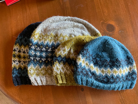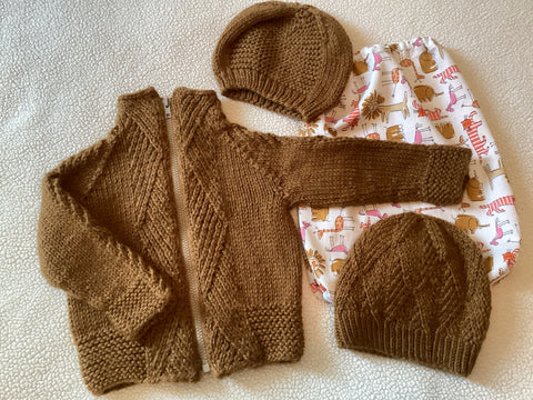 Tin Can Knits Urban Hiker cardigan, Barley hat, Sitka beanie - Berroco Vintage.