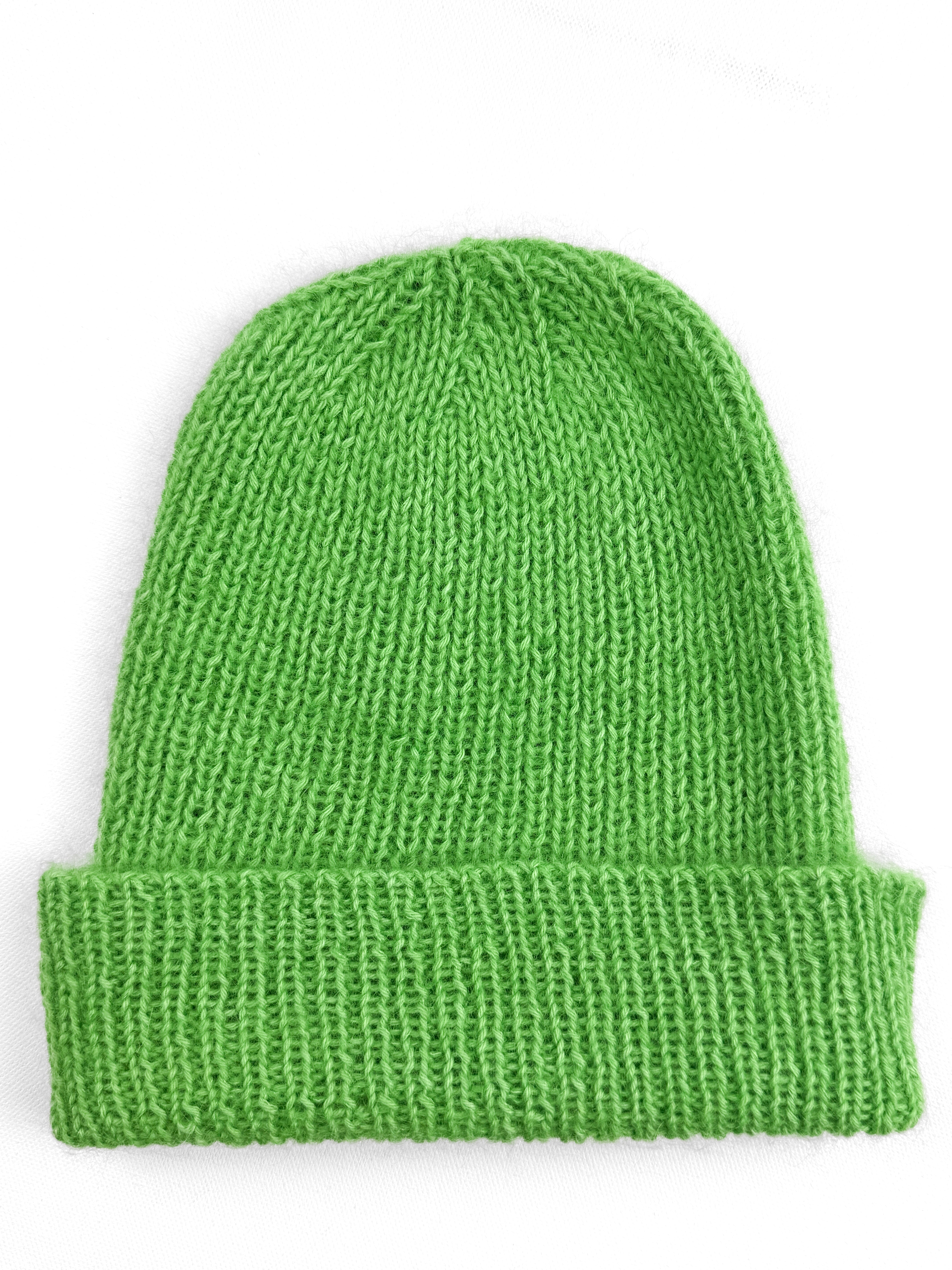 Sample used 1 ball of Filcolana Merci #618 ‘Mojito’ held with 1 ball of Filcolana Tilia #279 ‘Juicy Green’. Hat is 30 cm (12”) long and has a 7.5 cm (3”) folded brim when worn.